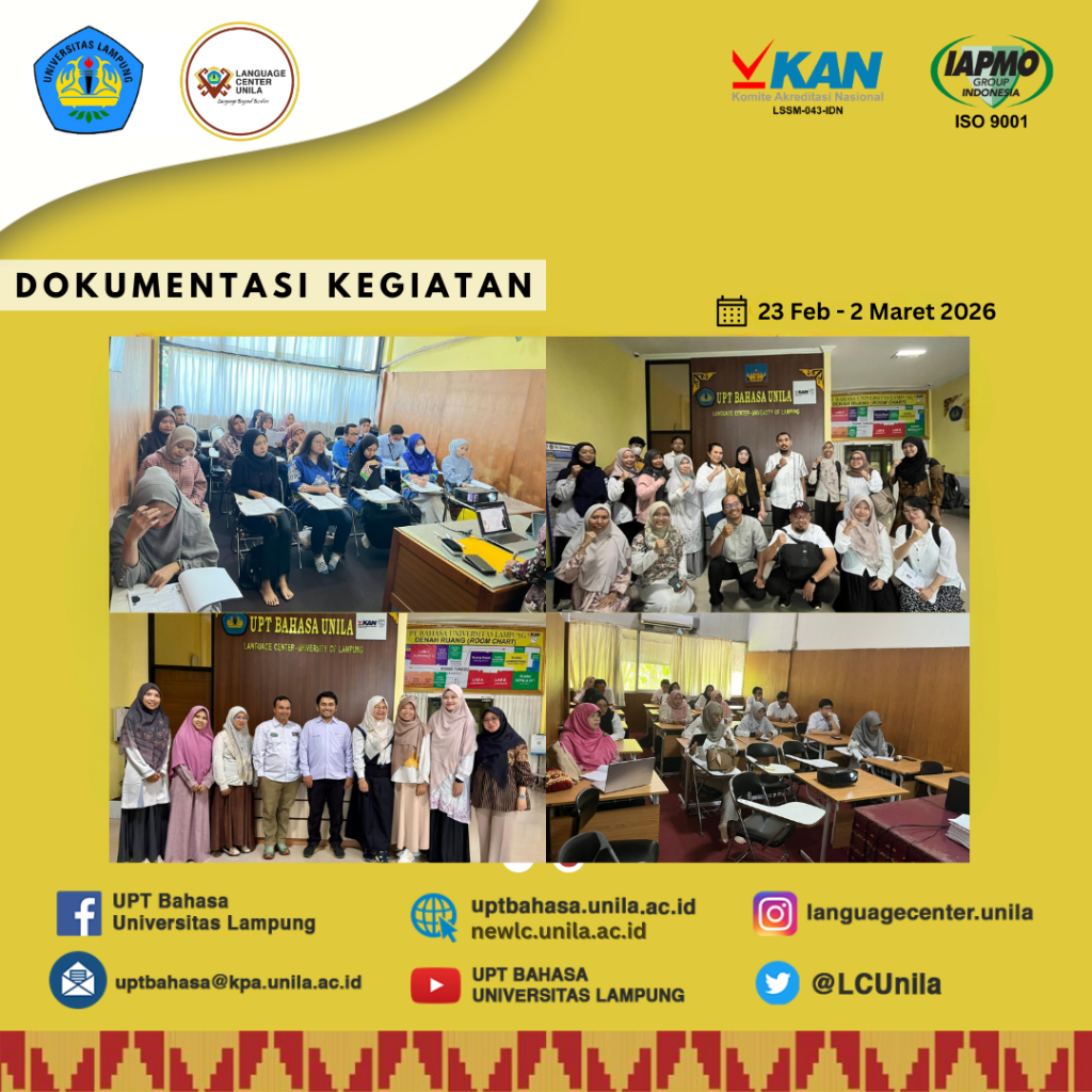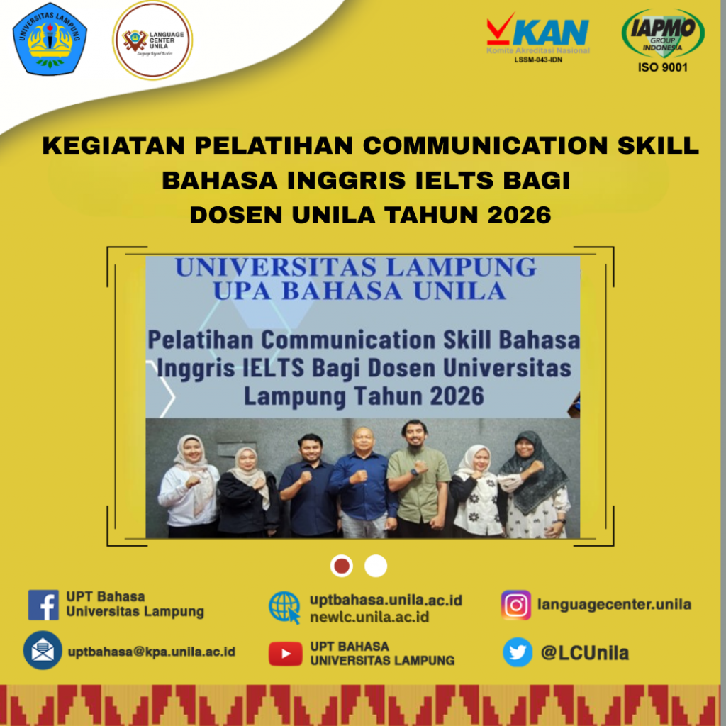 (Bandar Lampung) — Seperti tahun-tahun sebelumnya, telah menjadi agenda tahunan UPA Bahasa Universitas Lampung mengadakan Kegiatan Pelatihan Communication Skill Bahasa IELTS bagi Tenaga Pendidik/Dosen di Universitas Lampung. Dengan diikuti peserta pelatihan dosen dari berbagai Fakultas di Universitas Lampung, kegiatan pelatihan kali ini dilaksanakan di Ruang Kelas UPA Bahasa sejak 23 Februari s. 2 Maret 2026.